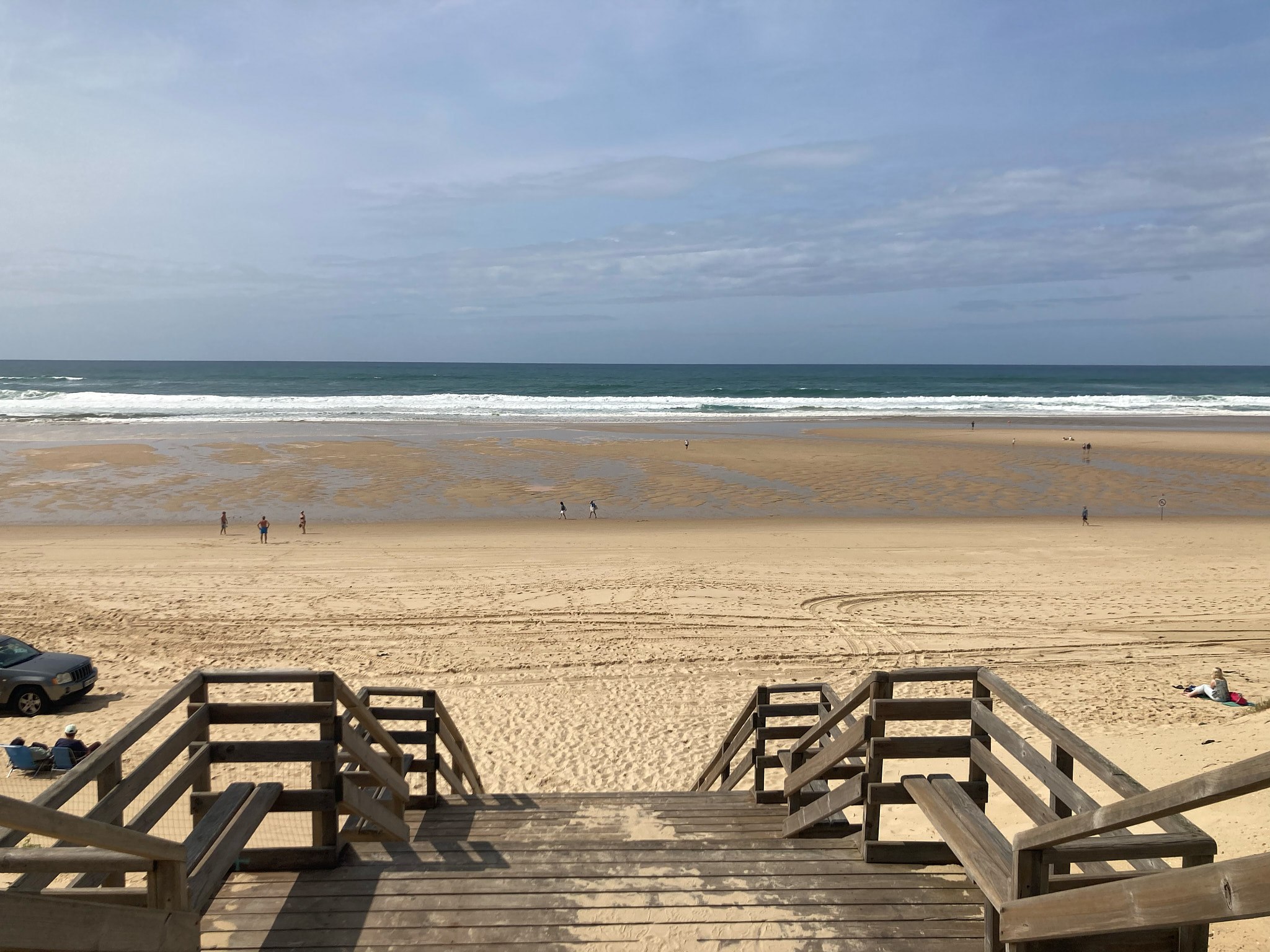 Uiteindelijk kom je dan in Mimizan uit en vanaf daar rijden we verder door naar zee. Het weer is prachtig en uit de wind is het behoorlijk warm. Voor de fransen loopt het seizoen al ten einde, men is bezig met het afbreken van de strandtenten. Wij breken nog niet op en gaan de komende dagen nog meer van deze omgeving verkennen op de fiets.