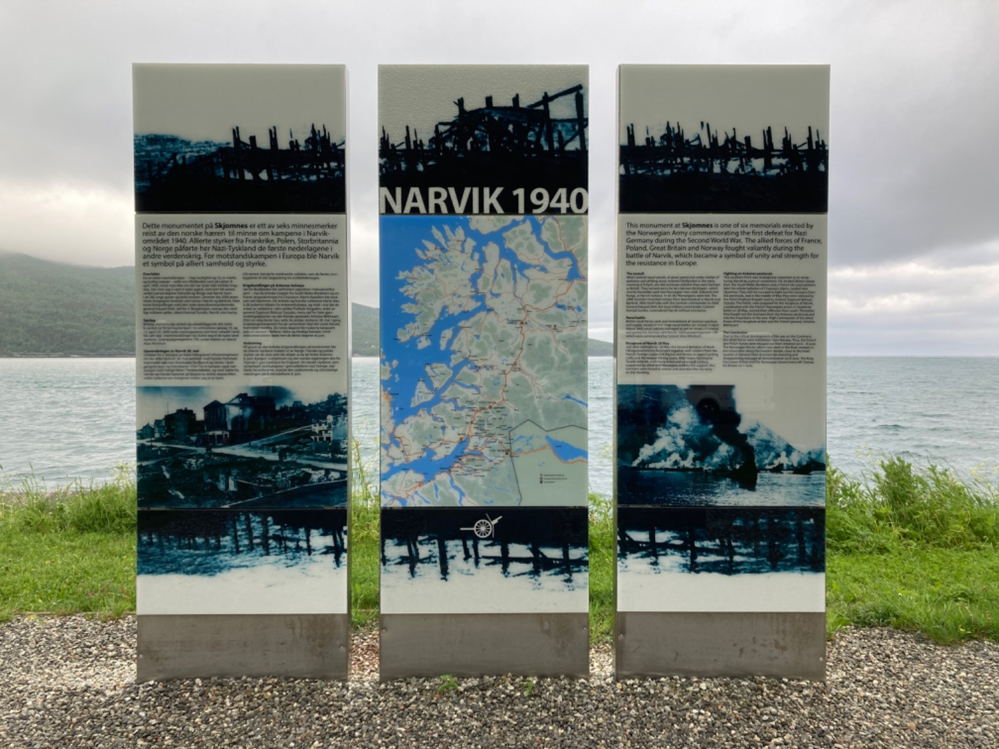 Vandaag hebben we een mooie plek aan het water gevonden om te overnachten. We staan op een plek even ten zuiden van Narvik met een herdenkingsmonument aan de Tweede Wereldoorlog. Het monument gaat over de Slag om Narvik. De Duitsers hebben in april 1940 Narvik ingenomen om daarmee toegang te krijgen tot het ijzererts dat over het spoor uit Kiruna in Zweden komt. Nodig voor de oorlogsindustrie. Hier is daarna maandenlang zwaar gevochten door de geallieerden met veel verliezen aan beide kanten.