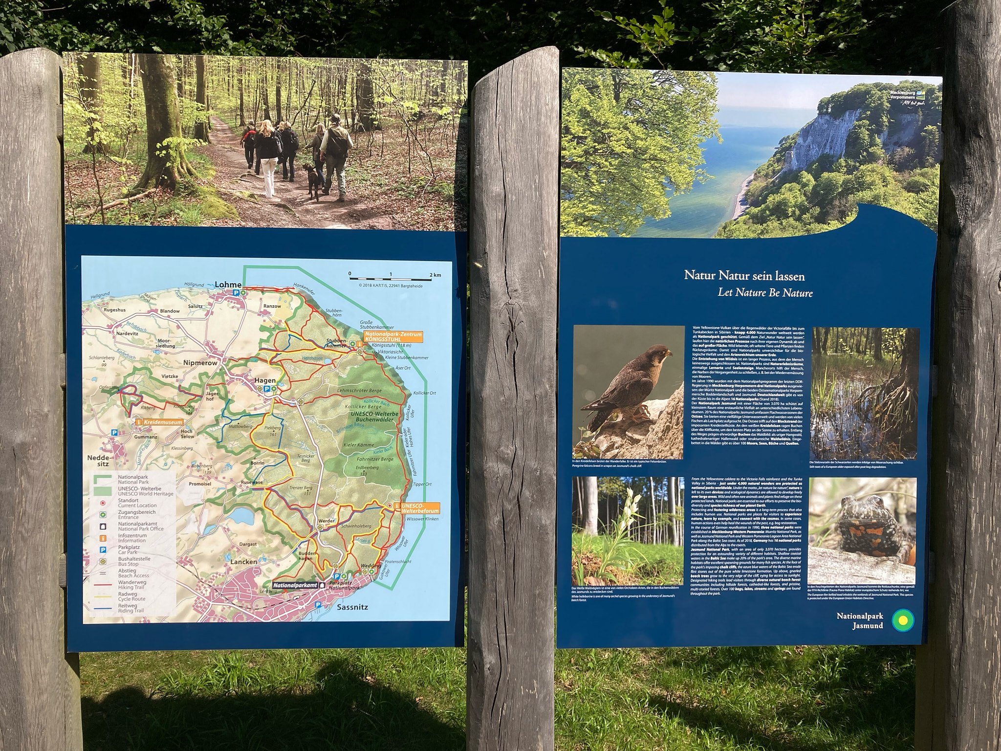 Het Nationalpark is een prachtig bosgebied met voornamelijk beukenbomen en de kust bestaat uit krijtrotsen. Dat geeft geweldige uitzichtpunten over zee. Op één plek aan de kust moet je 12,- euro entree betalen om ervan te genieten, wat wij nogal overdreven vinden. Bovendien was het er erg druk. De toeristen worden hier met busladingen afgeleverd, dus het is wel kassa daar. Advies voor als je naar Rügen gaat: Königsstuhl gewoon overslaan.