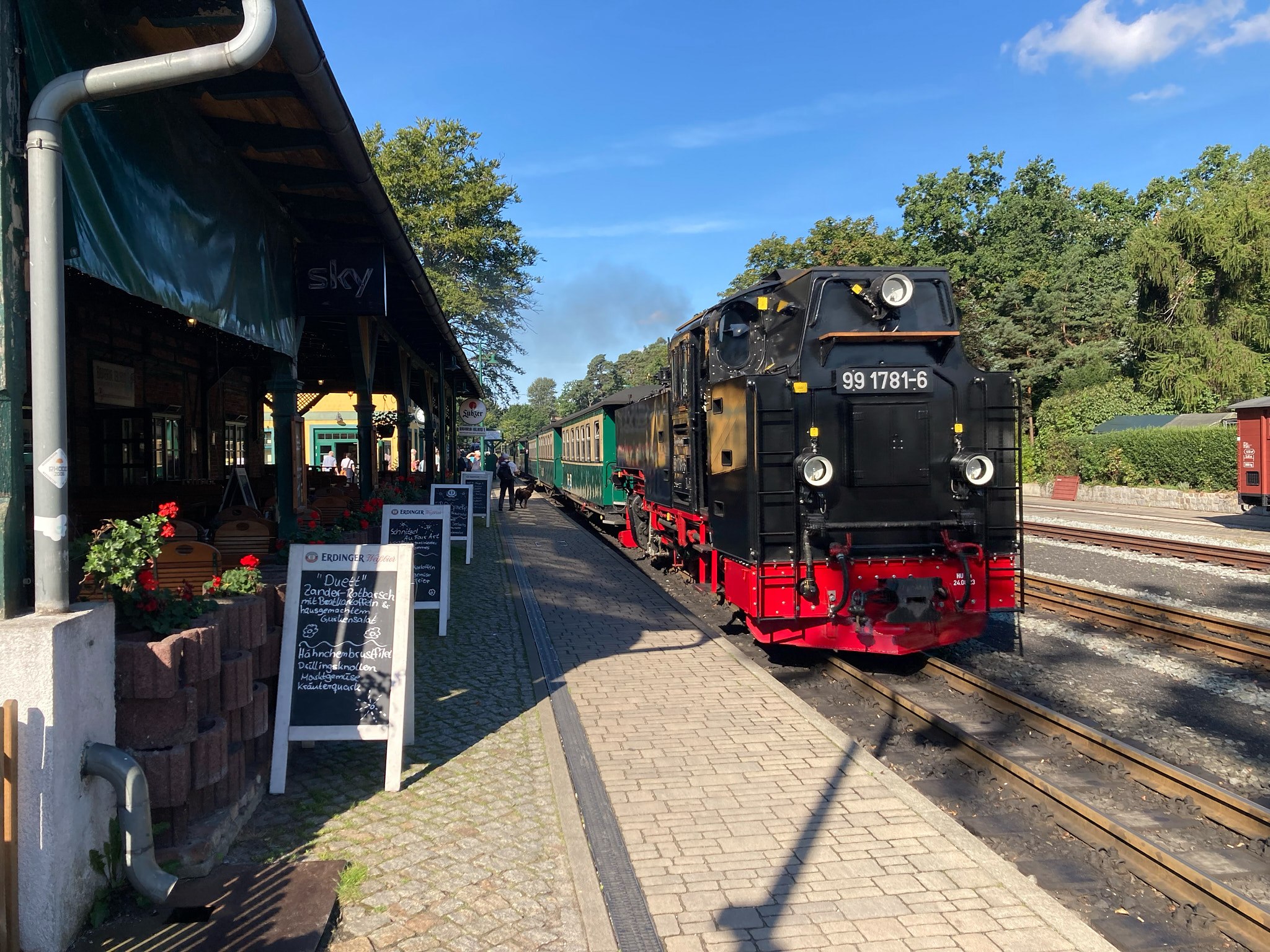 De fietstocht begint vandaag op het station Göhren van de Rasender Roland. We nemen hier een stukje de stoomtrein naar het station Jagdschloss Granitz om vanaf daar verder te fietsen. Het kasteel is volgens de beschrijving een van de mooiste van Duitsland. Wij gaan er niet naar toe want je kunt er alleen komen als je een kilometerslange helling met een stijgingspercentage van 8 tot 10% overwint. Op de fiets is dat voor een normaal mens niet te doen. Ook de conducteur van de trein waarschuwt ons nog even om er niet aan te beginnen. Dat waren we ook echt niet van plan! Wij willen vandaag juist meer van het landschap zien in het zuidelijke deel van Rügen.