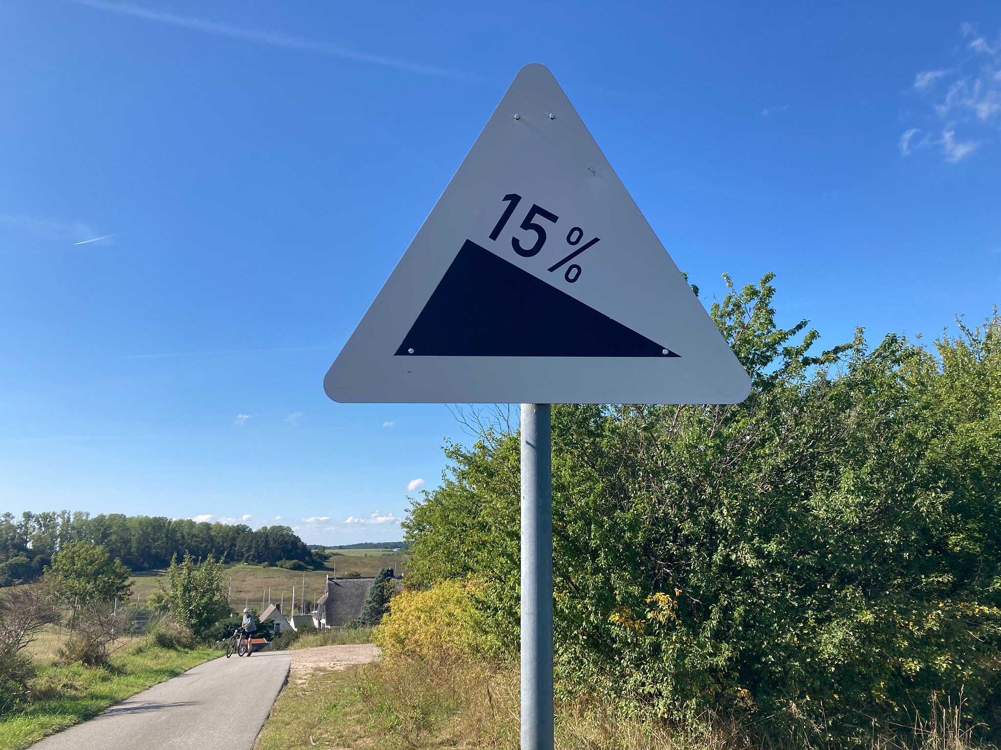 Dat wil overigens niet zeggen dat we nu voor de makkelijke optie hebben gekozen. Het eerste pad door het bos omlaag bestaat namelijk uit kasseien en dat is niet de laatste keer vandaag dat we dergelijke bestrating tegenkomen. Niet onze favoriet dus. En passant krijgen we in het sowieso heuvelrijke landschap nog een paar fietspaden voor onze kiezen met stijgingspercentages van 13% en zelfs 15%. Dan is het alleen het duwen van je fiets al een aardige klus.