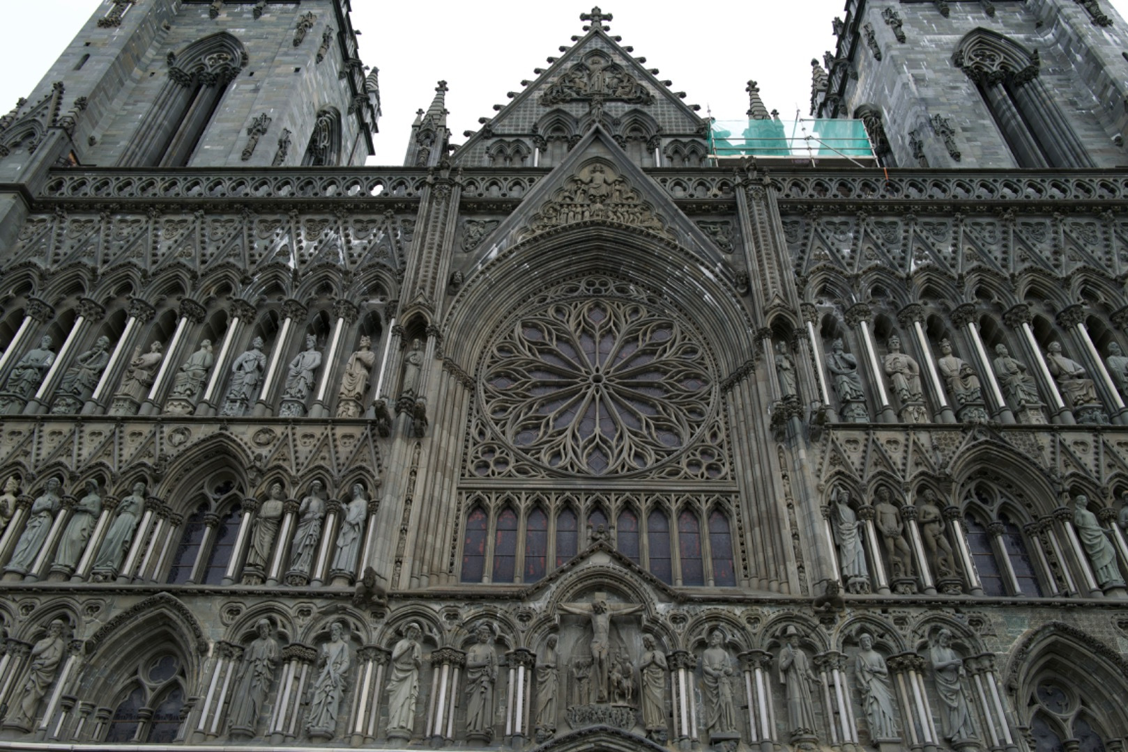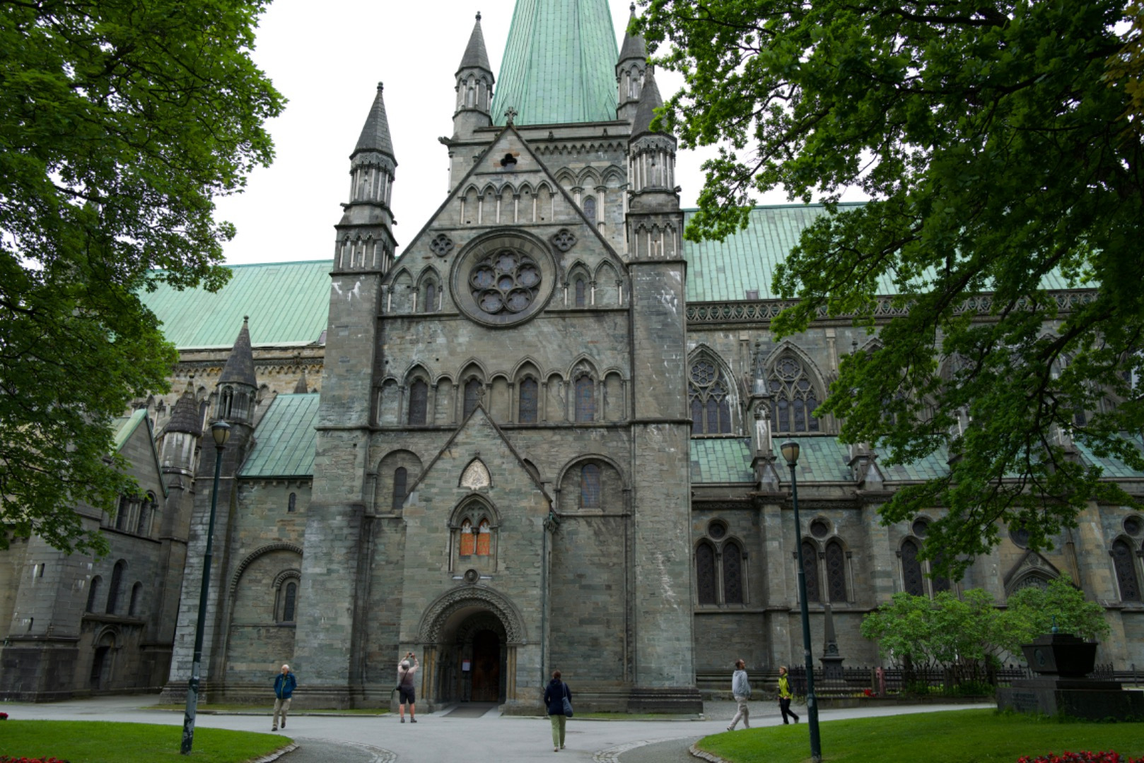 We bezoeken onder andere de Nidarosdomen, een kathedraal die in 1.300 is voltooid en die een belangrijk bedevaartsplek is. Er zijn verschillende eenvoudige onderkomens voor bedevaartgangers in Trondheim te vinden. Net als wij een kaartje willen kopen voor een bezoek aan de kathedraal komt er een bus vol met toeristen van de Hurtigruten cruise aan die allemaal naar binnen willen. We hebben geen zin in die drukte en maken daarom een rondje langs de buitenkant van dit fraaie gebouw in gotische stijl.
