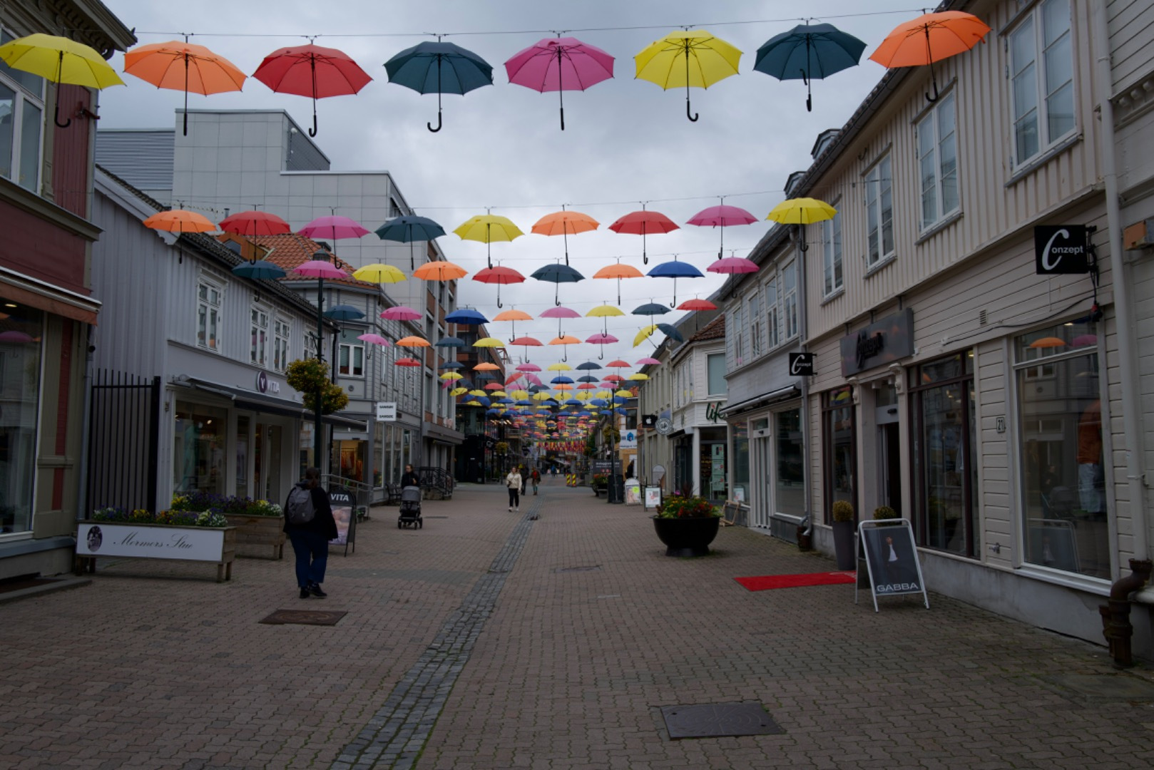 Naar Trondheim kan je het beste met openbaar vervoer. Geen last van tol, hoge parkeertarieven en zoeken naar een geschikte parkeerplaats. Het is overigens lang geleden dat we voor het laatst in het ov zaten. Vanaf de camping ga je eerst met de bus en daarna met de stoptrein naar de stad. Het hele ritje kost maar 2 euro per persoon tegen het seniorentarief (!). Normaal is het twee keer zo duur. Het belooft in ieder geval een droge dag te worden met temperaturen tussen de 10 en 12 graden. En anders houden de paraplu’s die in sommige straten zijn opgehangen ons wel droog.