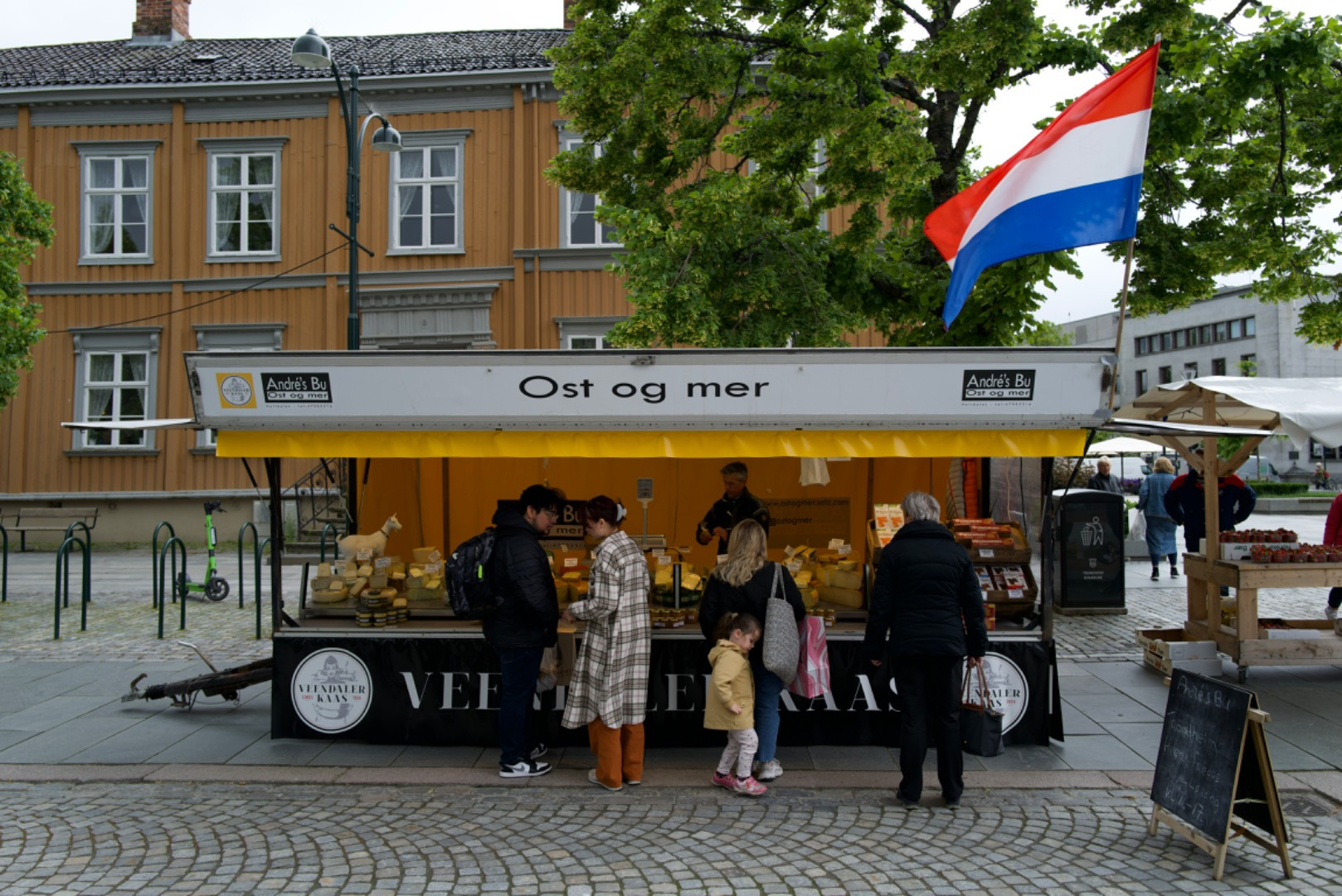 Op het centrale plein is het markt. Verrassend genoeg is er een kraam met nederlandse kaas en een nederlandse eigenaar André. Hij woont al 15 jaar in Noorwegen en heeft als hobby de verkoop van kaas. Een lekker smaakvolle kaas uit Nederland kan je natuurlijk niet laten liggen als je in de supermarkt alleen maar van die flauwe noorse kazen tegenkomt. Een goede kaas hebben we al weken gemist. We gaan hier een feestje van maken!