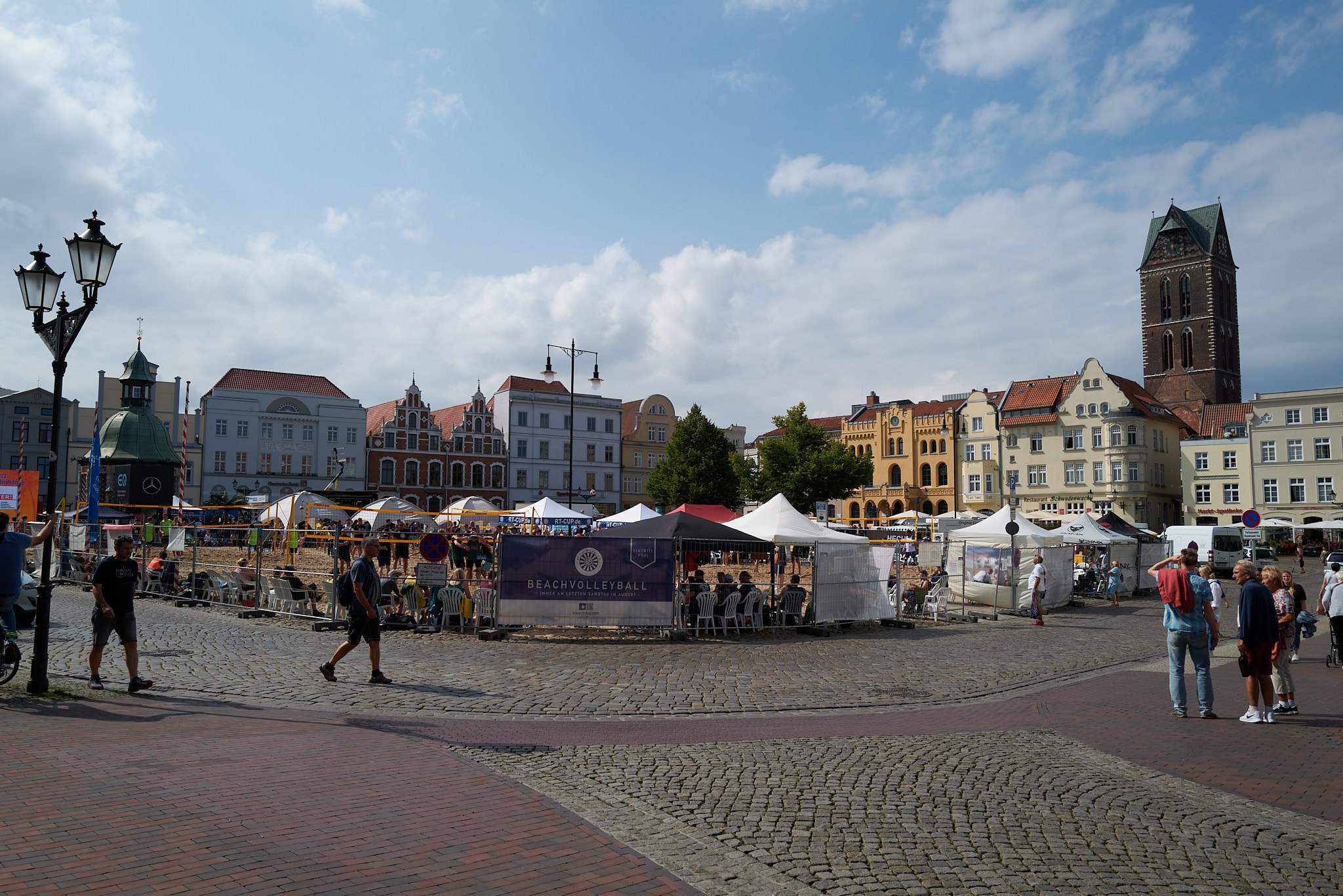 De markt is omringd met mooie oude gebouwen die bijzonder goed zijn onderhouden en er was een beachvolleybal toernooi gaande. Een paar vrachtwagens zand, een feesttent en een dikke geluidsinstallatie, alle ingrediënten voor een vrolijke boel.