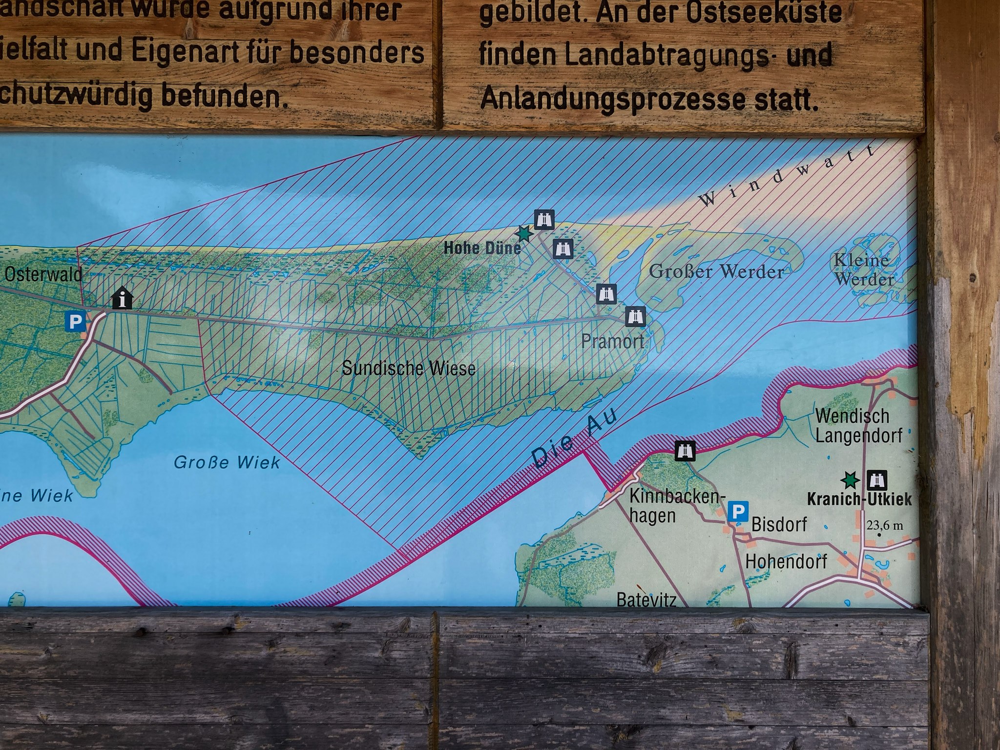 Er is een wandeling van 1,5 kilometer naar het uitkijkpunt de Hohe Düne dat erg de moeite waard schijnt te zijn. Het biedt uitzicht vanaf het 13 meter hoge duin over het witte strand aan de Oostzee. Op een mooie nazomerdag als vandaag waan je je volgens de beschrijving dan in het Caribisch gebied. Je mag er alleen te voet naar toe over het wandelpad, maar dat is met onze fietsschoenen aan geen optie. Dus we houden het op de goed aangelegde fietspaden.