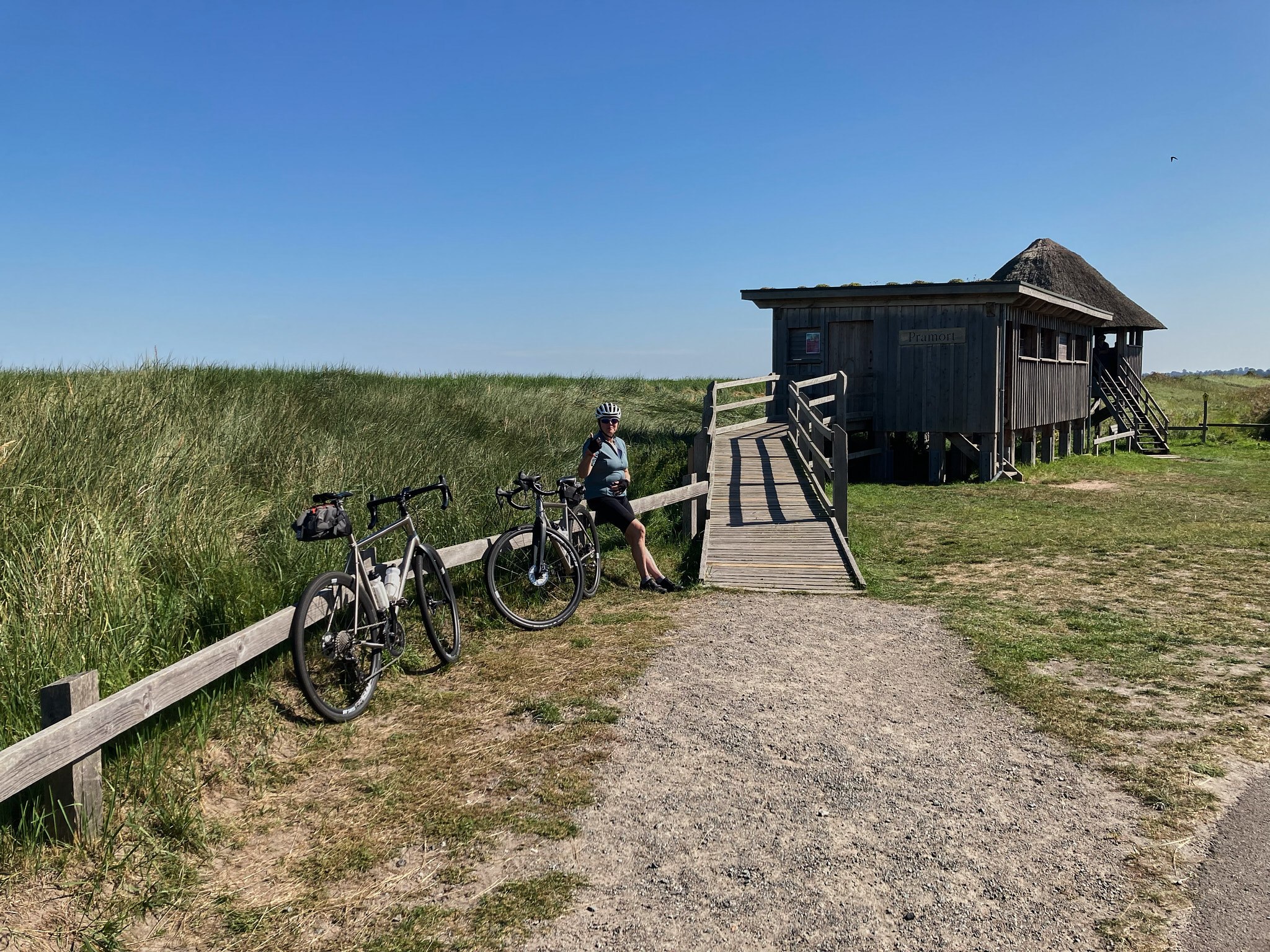 Onze tocht van vandaag gaat naar het meest oostelijke punt dat je op de fiets kunt bereiken, genaamd Pramort. Hier is een vogelkijkhut aangelegd. In deze tijd van het jaar fourageren er onder andere de kraanvogels. De voetpaden in dit gedeelte zijn daarom nu van ‘s middags drie uur tot ‘s morgens acht uur afgesloten. Je kunt er dan alleen in met een speciale toegangspas of met een gids.